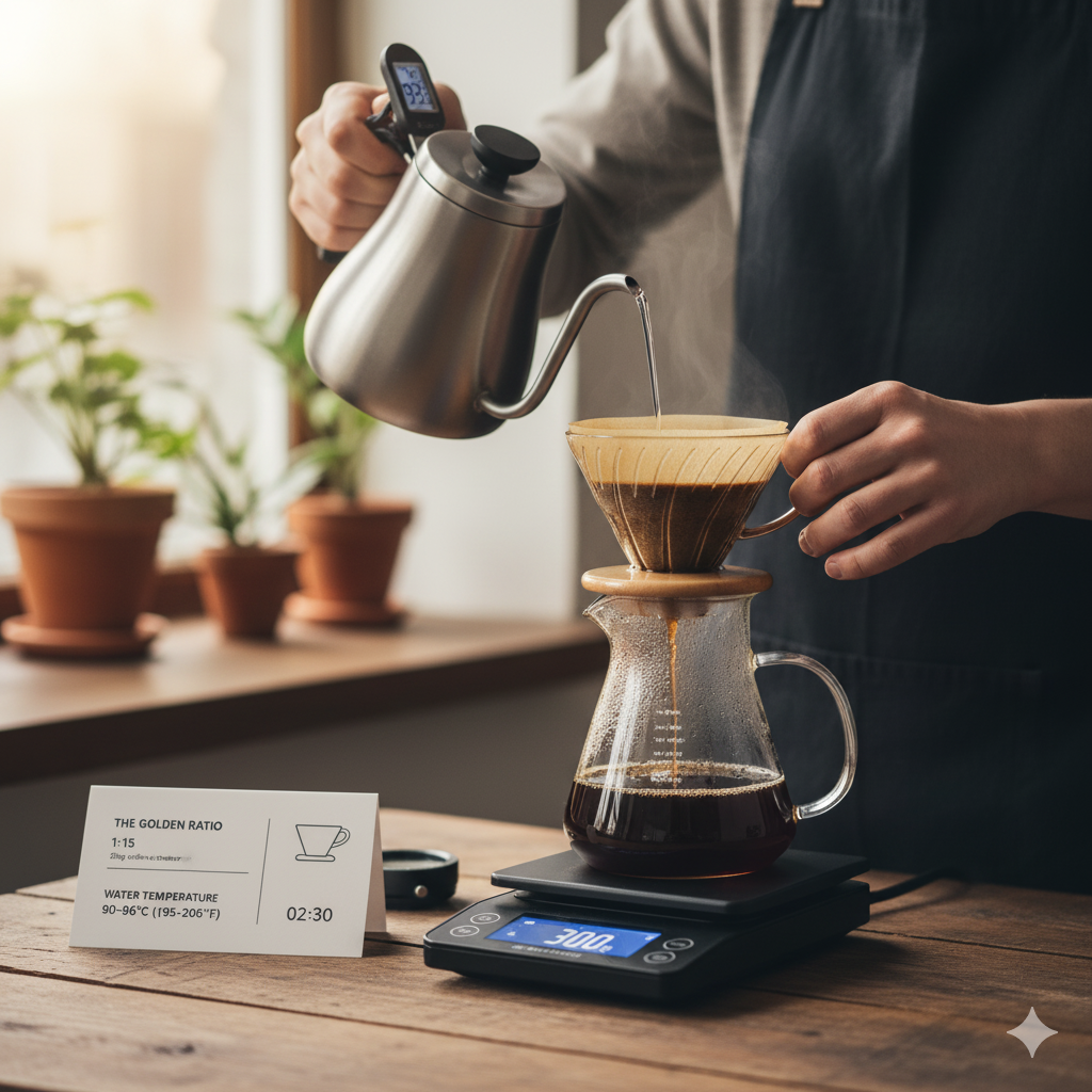 드립커피를 안정적으로 즐기려면 자신만의 ‘황금비율’을 찾아야 한다. 황금비율은 단순히 원두와 물의 비율뿐 아니라, 추출 속도·물줄기 패턴·시간의 조합으로 완성된다.